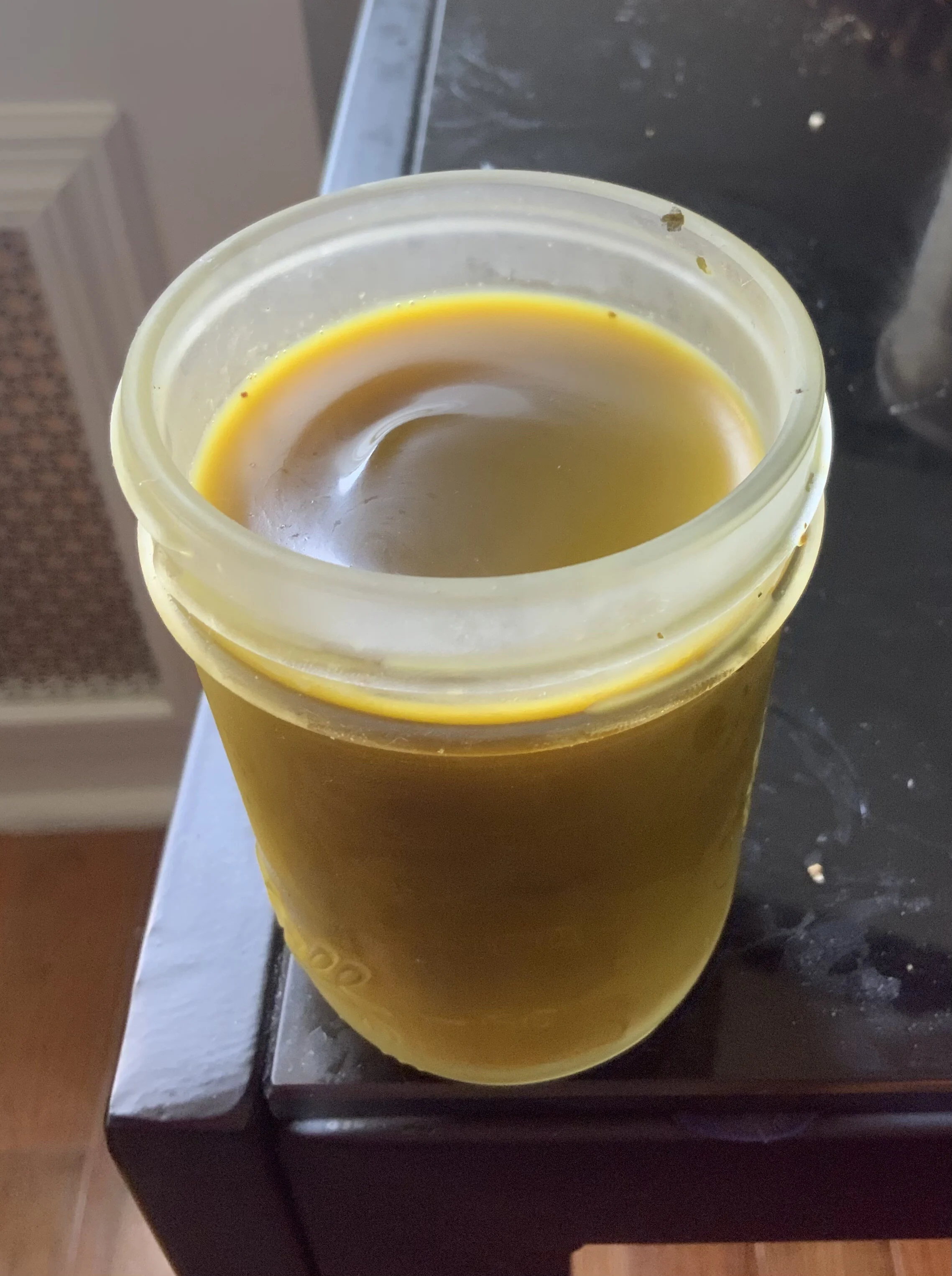 Strain the butter mixture through the cheesecloth or mesh strainer, then immediately add the hemp seed oil.